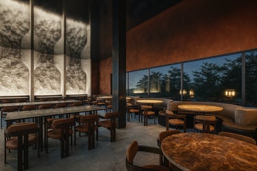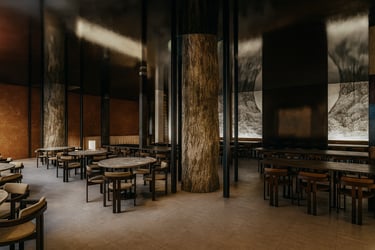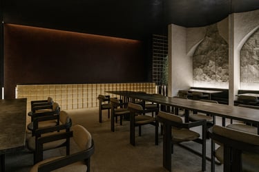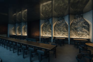 The design of rocks enclosed in Iranian architectural arches, imprinted on the interior and exterior walls of the music hall, and the use of microcement coating for these rocks, as well as the use of cement coating with a rusted iron appearance on the adjacent wall and the selection of metal as the main material for the hall furniture, all demonstrate the superiority of a design with a fusion style.
